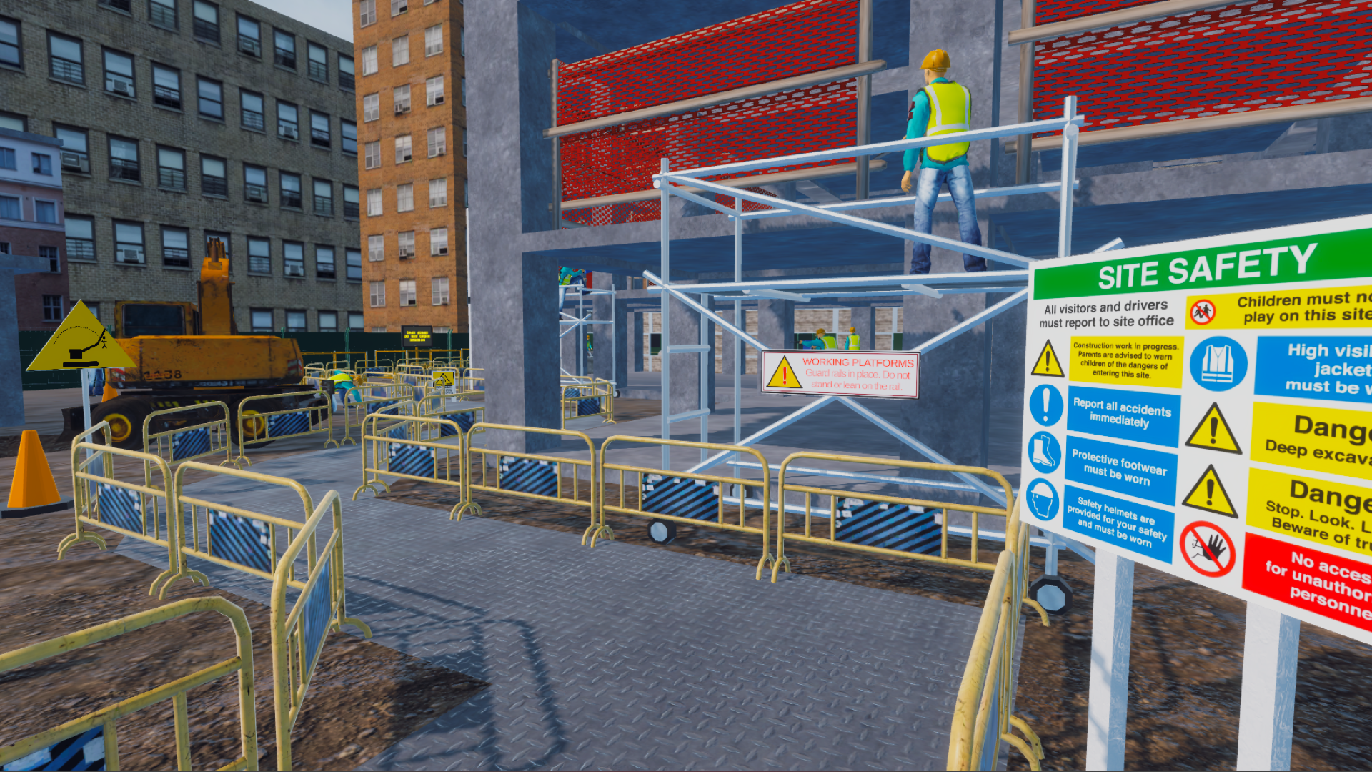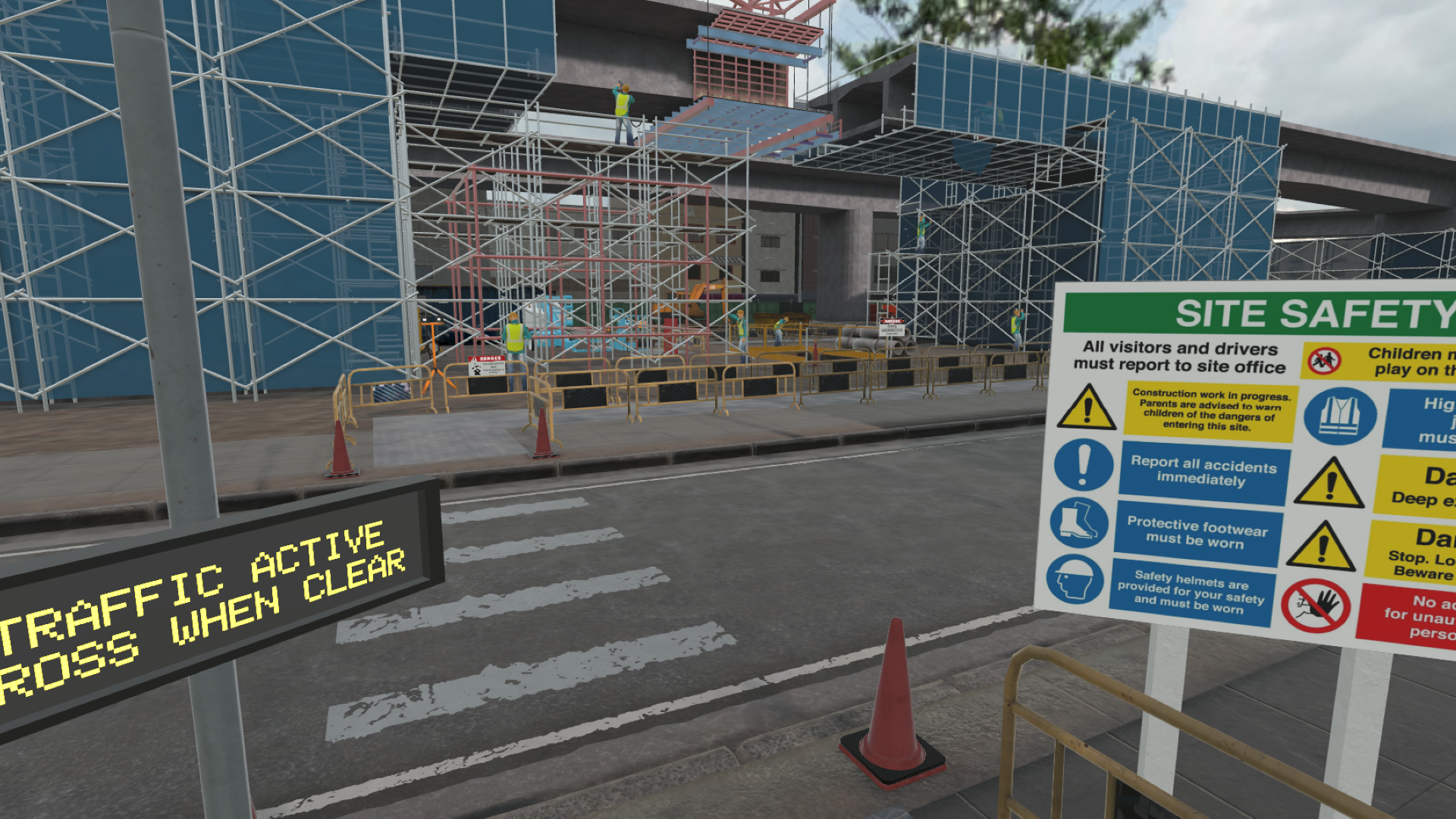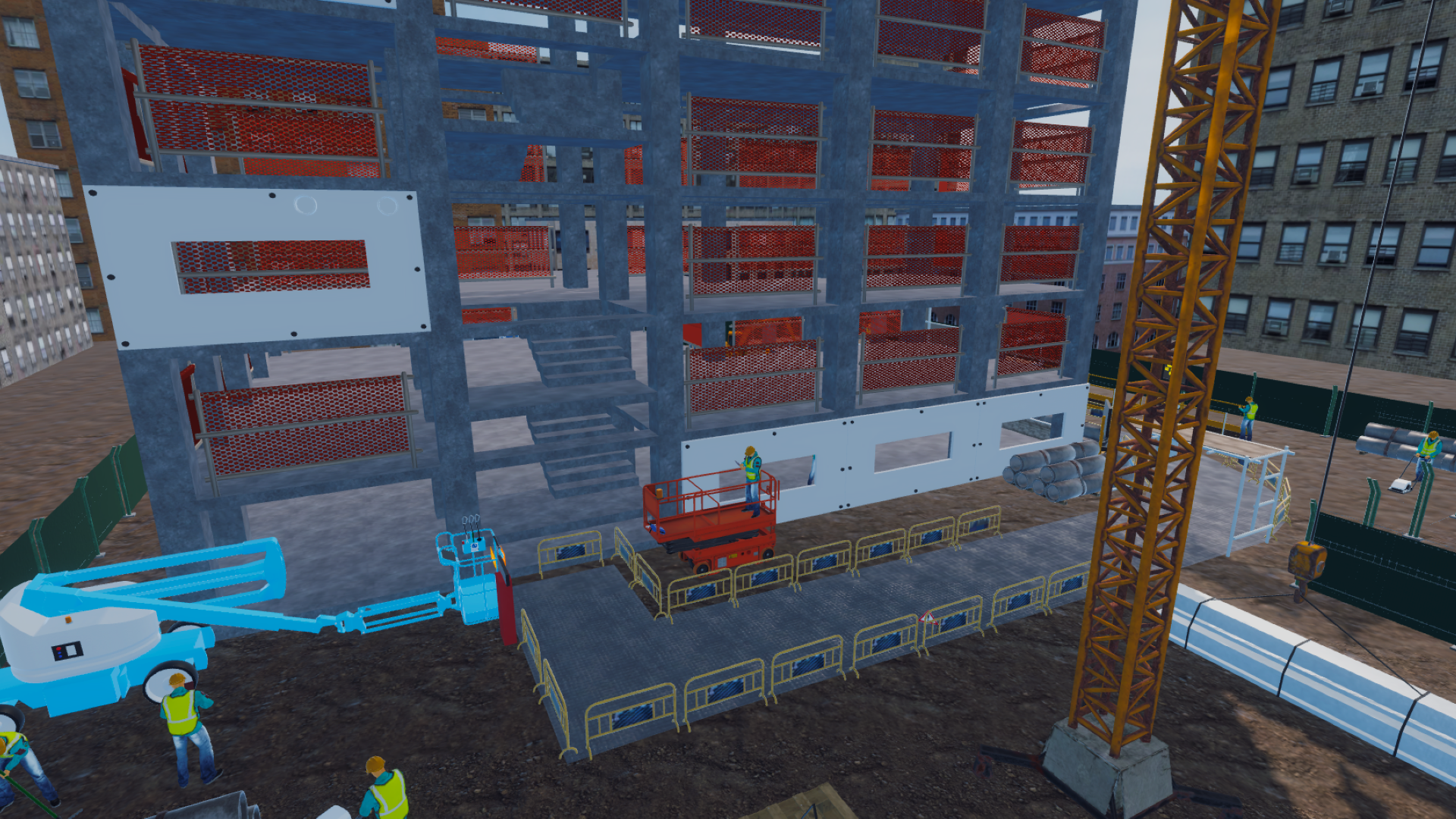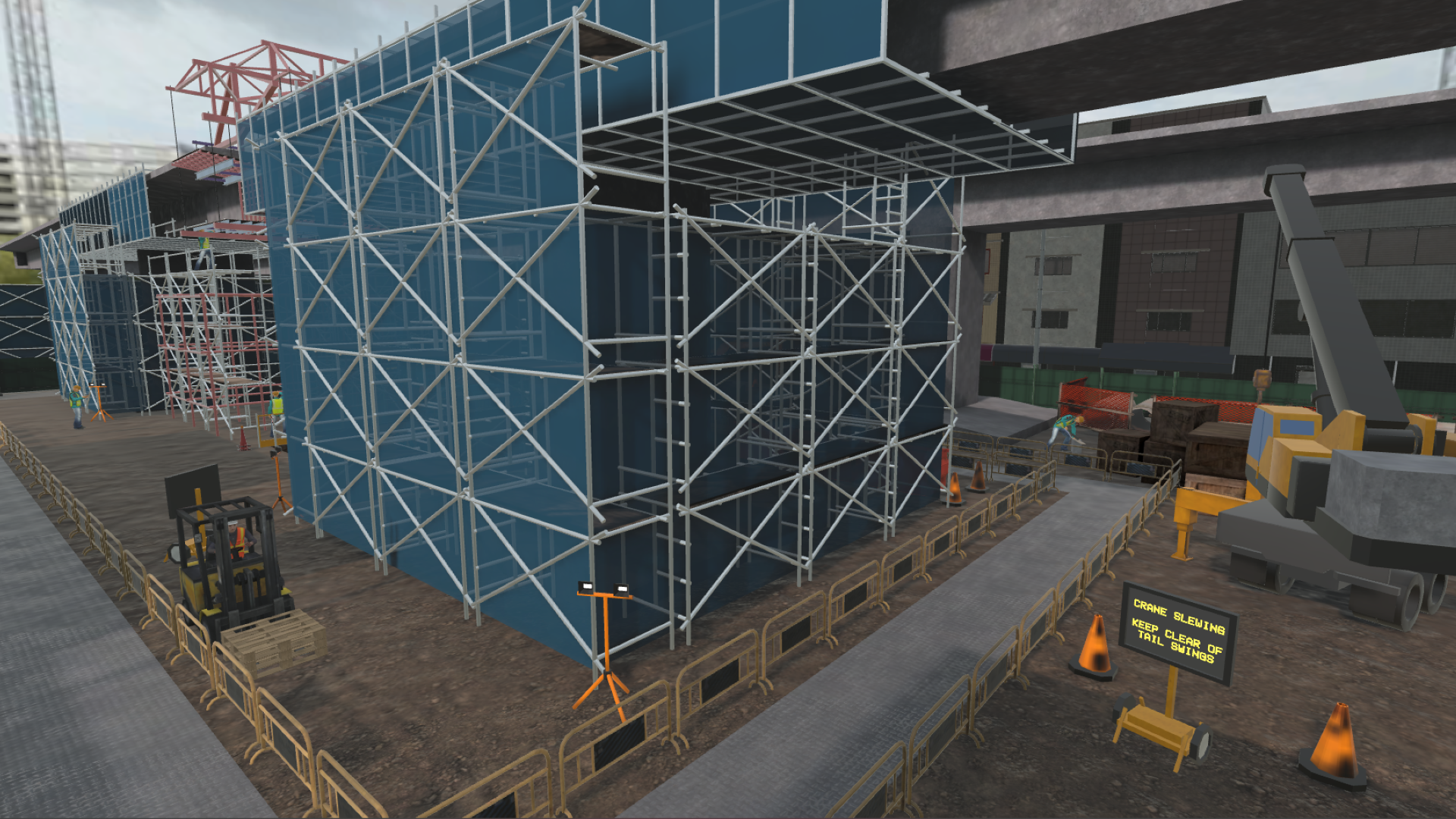 The simulation features two distinct, busy construction sites, where a critical concrete repair task must be conducted at height. Site 1's environment simulates the construction of a building, whilst Site 2 simulates the repair of a bridge. The repair objective is to repair a damaged section of the site, which is crucial for ensuring long-term structural integrity and safety. The task requires the safe use of a Mobile Elevated Work Platform (MEWP), and strict compliance with Work at Height safety regulations.